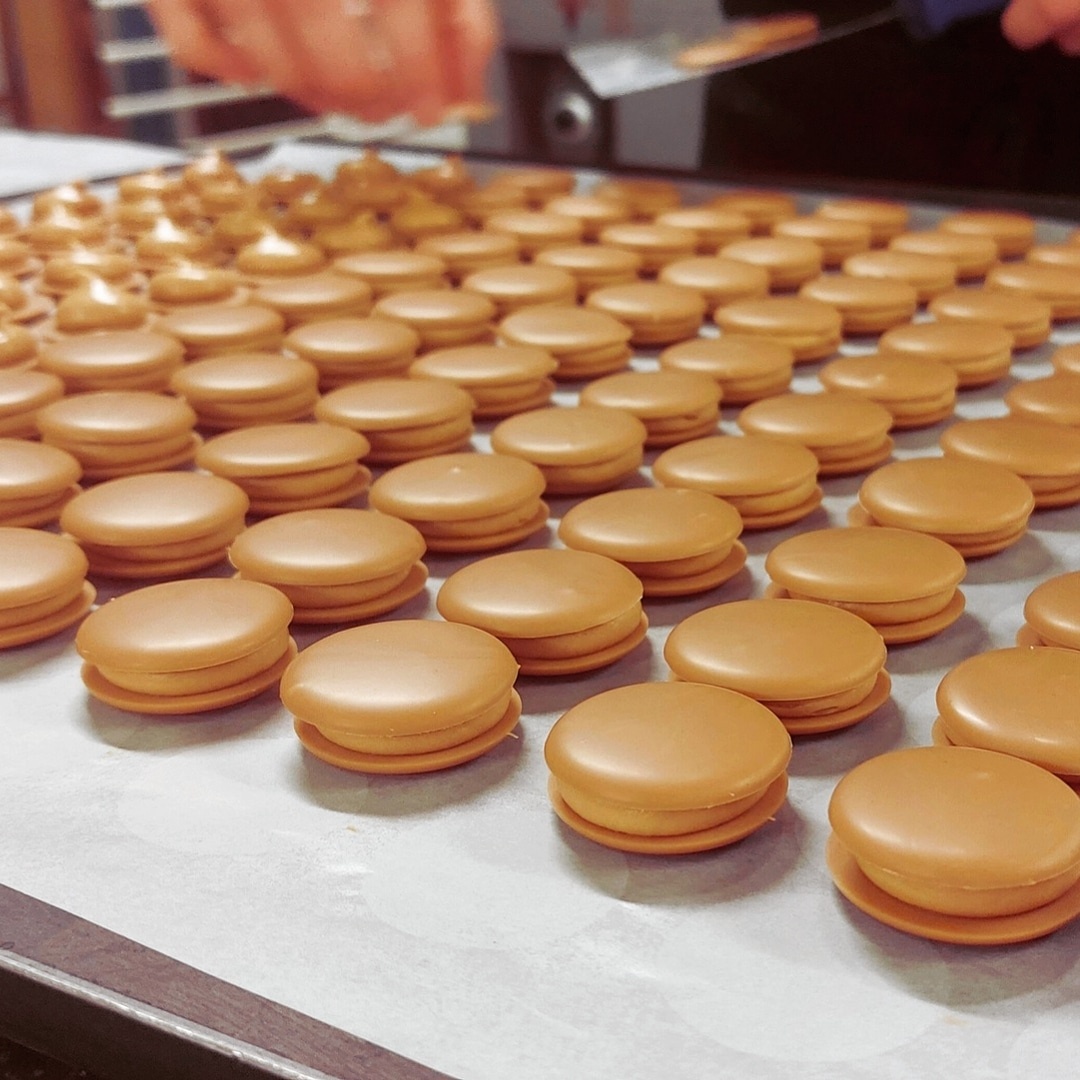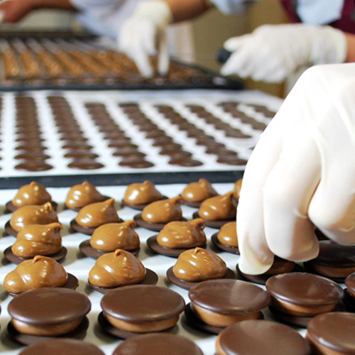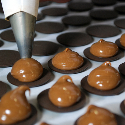 Twee schijfjes pure chocolade met daartussen een vulling van melkchocolade en boter.